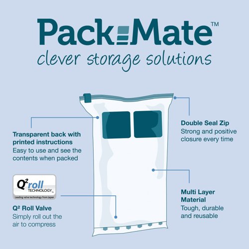 - Packmate Travel/Roll Vacuum Storage Bags are the perfect way to get more into luggage. Without the need to use a vacuum, simply roll out the air using the patented one way valve. The 'Jumper Graph' helps guide purchasers to choose the correct size. Providing on average, 4 times more space, they will also protect the contents from dirt, dust, damp and bugs. Made from a multi-layer laminated blend which includes Nylon to help prevent rips, punctures and tears, they provide years of use and can be fully recycled. Supplied in a pack of 2.