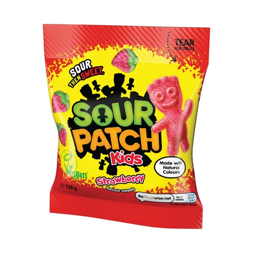 - Sour Patch Kids are packed with fruit flavours and a serious sour punch. Packed into a generous 135g bag, these sour gums sweets in strawberry flavour are perfect for sharing or as a sweet treat. Supplied in a pack of 10 x 130g bags.