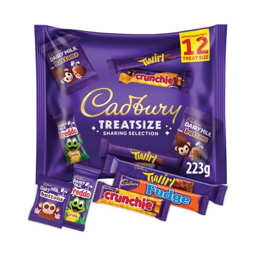 - A great selection of Treatsize Cadbury favourites. Contains milk chocolate buttons, Crunchie, Freddo, Fudge and Twirl.