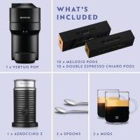 - Keeping low profile at 25cm, the Vertuo Pop is a sleek, compact coffee machine supplied in black. With automatic brewing parameters, the machine delivers signature crema, smooth taste and full flavour at the touch of a button. From espresso to mug, the choice from four cup sizes in a wide variety of blends including: Ristretto, Espresso 40ml, Double Espresso 80ml, Gran Lungo Cup 150ml, Mug 230ml and Large Mug 355ml. Made from 35% recycled plastics and rated energy efficient, it uses Vertuo coffee pods made from recyclable aluminium. This pack includes a complimentary welcome set of 12 Vertuo coffee pods.