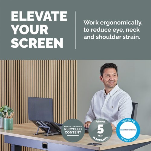 The Fellowes Alumia Portable Laptop Stand is designed to help minimise discomfort in your workspace by elevating your laptop to a more ergonomically correct viewing position, reducing neck and eye strain. It supports laptops up to 5kg in weight and screen sizes up to 15 inches. With six easy-to-use height adjustments ranging from 8.1 to 13 cm, it promotes good posture and all-day comfort. The compact and lightweight design folds flat, making it perfect for storage or on-the-go use - ideal for hybrid working environments. Nonslip pads keep your laptop securely in place, while the open design enhances air circulation to help keep your device cool. The Alumia Portable Laptop Stand is FIRA-accredited, meeting the ergonomic requirements of European Health and Safety legislation (EN ISO 9241-5).