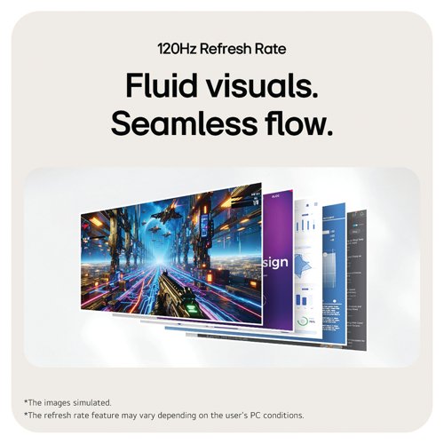 This LG FHD (1920x1080) screen delivers clear visuals with an sRGB 99% (Typ.) colour gamut and a 1500R curvature, enhancing work productivity. he ultra-slim bezels and 3-side virtually borderless design creates a clean, modern look that keeps your focus where it belongs-on the screen. The sleek stand and base adds a floating feel, perfect for dual setups or a clutter-free workspace. With a fast 120Hz refresh rate, you'll experience smoother frame transitions. Whether you're working or gaming, enjoy more fluid visuals with less screen stutter and motion blur.