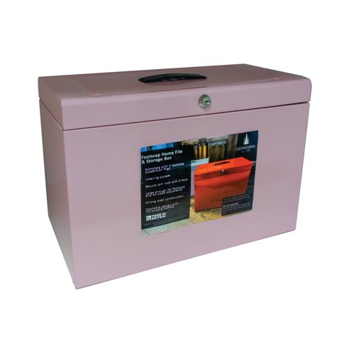 - The Cathedral foolscap metal home file box is a strong and durable storage solution for all paperwork. Supplied complete with five suspension files, each with a clip-on index tab and paper label. The fold down carry handle makes it easy to transport and the cam lock ensures files are safe and secure.