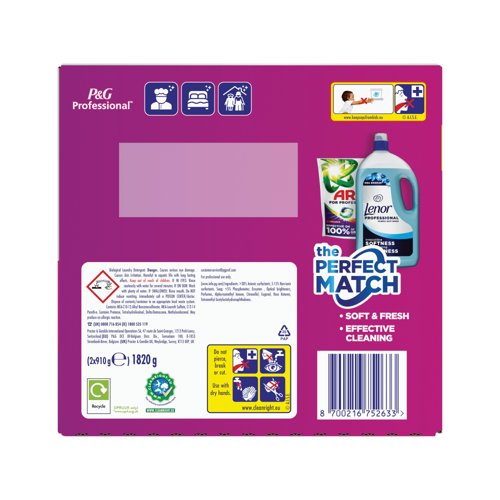 Discover the power of Ariel Professional Washing Detergent, tackling the toughest stains. Delivering outstanding cleaning in just one wash, even at low temperatures (30 Degrees Centigrade). Protecting colours, Ariel Professional also helps to remove unpleasant odours. Designed for tough stain removal, the formula is effective on greasy stain types, based on typical types of greasy stains found in professional businesses. The easy dosing of one pod per wash, means that this pack gives 100 washes in total.
