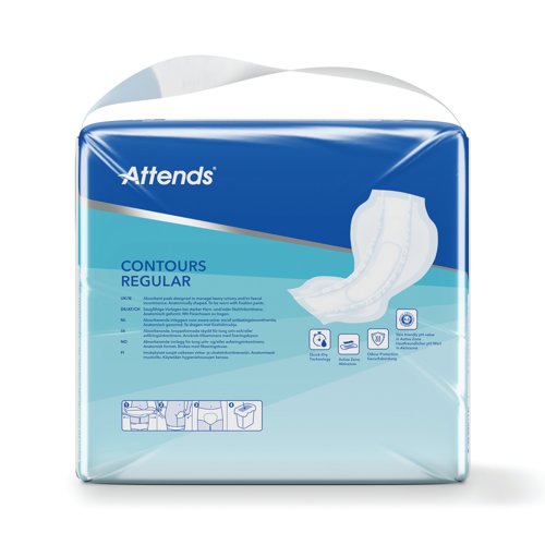- Attends Contours Regular 9 are body shaped pads designed to manage heavy bladder or bowel incontinence (urinary or faecal incontinence). This pad is designed to fit close to the body for extra comfort and leakage protection even when experiencing multiple gushes. Wetness indicator on the back sheet helps individuals and carers get the most from each pad. Supplied in a pack of 28.