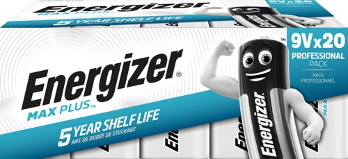 - Max Plus™ batteries deliver reliable performance throughout usage, meeting every professional’s needs – made to last, not to leak. Designed to meet the demands of today’s most power-hungry devices, Max Plus™ 9V batteries offer long lasting power. Whether its everyday devices like torches to the most demanding such as walkie talkies, Max Plus™ delivers every time. And because this is a long-lasting alkaline battery, you’ll use less batteries, thus creating less waste. Max Plus™ batteries are now available in our larger 20x Batteries Business Packs, ensuring that you’ll never run out of power! These bigger value packs are re-closeable, making them easy to store and stack – perfect for battery storage, whilst also being 100% recyclable packaging. Finally, Energizer® Max Plus™ batteries are incredibly reliable. They can be used safely without damage to expensive electrical devices. Offering practicality and longevity, Max Plus™ 9V batteries withstand up to 5 years storage whilst maintaining power.