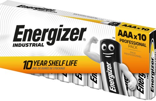- Energizer® Industrial Alkaline batteries are your go-to choice for the professional devices you use every day. Expect long-lasting power and reliability – for greater confidence in your tools and devices while on the job. Power your electrical devices with Energizer® Industrial AAA Alkaline. The re-closeable 10-Batteries Pack is the ideal solution for professionals as they are easy to store and stack, preventing batteries from accidentally falling out of the package. Energizer® AAA batteries will keep your electronic devices ready for the job ahead providing long-lasting, dependable, and proven performance. Plus, they also protect your devices from leakage for up to 2 years. With the reassurance of up to 10 years shelf life, Energizer® Industrial AAA batteries hold their charge whilst in storage. Designed for professional use, any industry can rely on the power and protection of Energizer.
