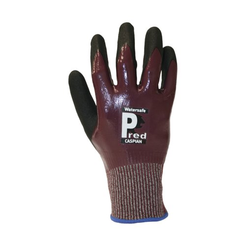 - Pred Caspian Watersafe Cut F Safety Gloves have a 13 gauge dark brown Nylon/Spandex/HPPE/ Steel/ Glass fibre Liner, fully coated in smooth nitrile and finished with a sandy nitrile palm coating. The gloves also have a coloured cuff size indicator. Supplied as 1 pair.
