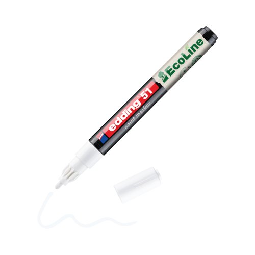 - The edding 51 EcoLine paint marker combines professional quality with a strong commitment to sustainability for those who demand uncompromising performance. Its water-based paint ink delivers high opacity and enables permanent marking on a wide range of smooth surfaces, including glass, metal and plastic, as well as on dark or transparent materials. The ink dries quickly and is waterproof and lightfast, making it ideal for both indoor and outdoor use. The 1-2mm round nib ensures clean, consistent lines. The odourless ink is free from toluene and xylene and contains only low levels of volatile organic compounds (VOCs), making it pleasant and safe to use. For added longevity, the marker is refillable with edding LT 25 refill ink (Sold separately). Supplied in a pack of 10 white marker pens in a folding case.