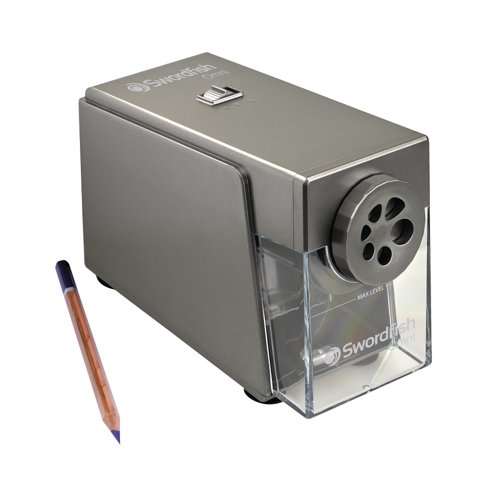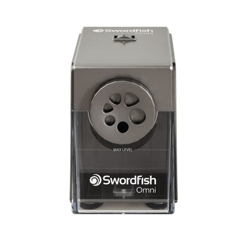 - The Swordfish Omni Electric Pencil Sharpener allows you to produce a sharp point, a blunt point or anything in between, customizing how you sharpen. You can sharpen standard 6, 7 and 8mm pencils to larger 9, 10 and up to 12mm pencils. With an auto stop function, stopping when the pencil is sharp, preventing over sharpening and pencil waste, the machine also includes a transparent slide-out shavings tray to reduce the need of frequent emptying.