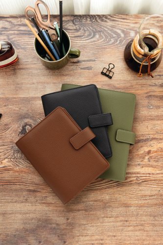 - A gender-neutral organiser created with sustainability and lifestyle organisation in mind. Crafted from vegan grain leather made from 100% post-consumer recycled plastic and featuring 100% recycled, fountain pen friendly paper, this collection offers a stylish yet conscious choice. With the innovative feature of charcoal removable rings, the Camden redefines flexibility and functionality, making it easier than ever to customise any planning experience. Supplied in black.