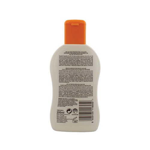 Clinically proven to be kind to the skin, this Malibu sun lotion offers high SPF 30 protection from UVA and UVB rays. Vitamin enriched and water resistant, the lotion should be applied generously and reapplied frequently during sun exposure. Supplied in a 200ml bottle with flip top lid.