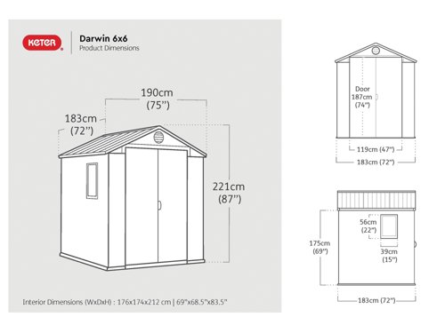 - The Keter Darwin 6x6 Shed looks great in any garden, and with its ample storage capacity, things will no longer be left out because there's no place to put them. This shed features a sturdy floor to protect what's in it from mud and groundwater, double doors so you can access what you want easily, and a window and skylight so you can see everything. It's metal-reinforced for super strength and durability, and it's completely weatherproof for year-round protection.