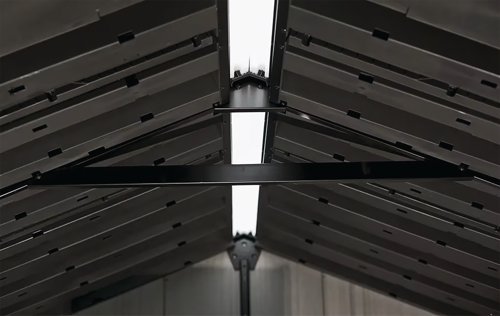 The Oakland Shed is built for durability, its weather-resistant Duotech wall panels provide the look and feel of worn wood. But unlike wood, it will never rot, rust, or dent, and the original finish won't peel. They can also be painted if desired. It includes a heavy-duty floor panel, wide double doors, fixed windows and skylight. Easy to assemble thanks to pre-cut tongue and groove panels. It also comes with a stainless steel locking system for additional security (lock not included). Comes with a D clip wall anchor kit, each set includes 10 anchors that can hold up to 50kg with each D clip holding up to 5kg.