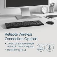 The KM270 EQ Rechargeable Desktop Set is a value-for-money wireless keyboard and mouse combination featuring a minimum 60% post-consumer recycled (PCR) content of the total plastic components.*Excludes printed circuit board (PCB) assembly , rechargeable battery, 2.4GHz dongle and charging cable.  * Compatible with both Windows and macOS, it offers convenient wireless 2.4GHz connectivity secured with AES 128-bit encryption and Bluetooth® connection options. The full size ANSI/ISO keyboard includes a numeric keypad and a dedicated Copilot AI assistant key**. Convenient LED indicators show visual confirmation of battery life, num lock, caps lock, pairing and scroll lock. A spill-proof design protects the keyboard electronics from accidental spills from coffee, water and other liquids. The quiet-click mouse is significantly quieter than a standard mouse, reducing noise in busy workplaces and accommodates both left and right-handed users. Wipe down protection certified. Includes 3-year limited warranty. ** Windows only.