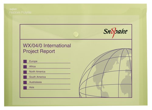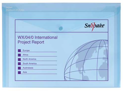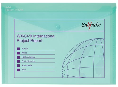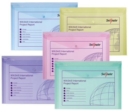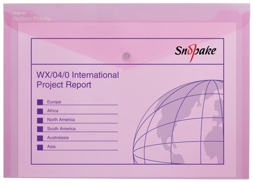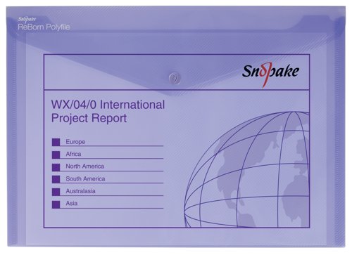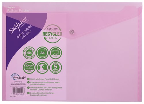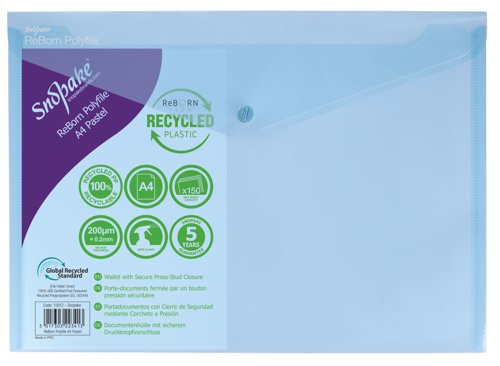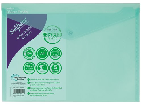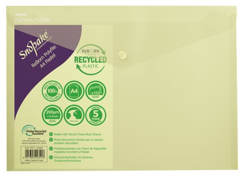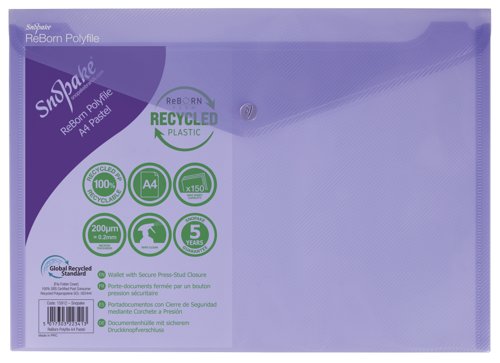 - This Snopake Reborn Polyfile in A4 size is ideal for punchless filing, you can store and organiser you documents, photographs and artwork in perfect condition in the water-resistant wipe-clean folder. Can hold up to 150 sheets of paper. Snopake ReBorn is made from 100% recycled, heavy-gauge and tough polypropylene, the responsible and eco-friendly choice. with a 5 year guarantee. The attractive transparent superline finish in soft pastel hues, is ideal for quick and easy identification of contents, secured by a colour coordinated press-stud closure.