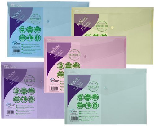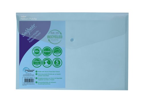 This Snopake Reborn Polyfile in foolscap size is ideal for punchless filing, you can store and organiser you documents, photographs and artwork in perfect condition in the water-resistant wipe-clean folder. Foolscap size is ideal for storing large envelopes and materials too big for traditional A4 popper wallets. Snopake ReBorn is made from 100% recycled, heavy-gauge and tough polypropylene, the responsible and eco-friendly choice. with a 5 year guarantee. The attractive transparent superline finish in soft pastel hues, is ideal for quick and easy identification of contents, secured by a colour coordinated press-stud closure.