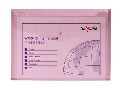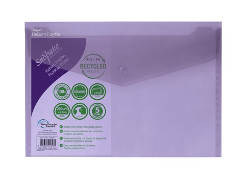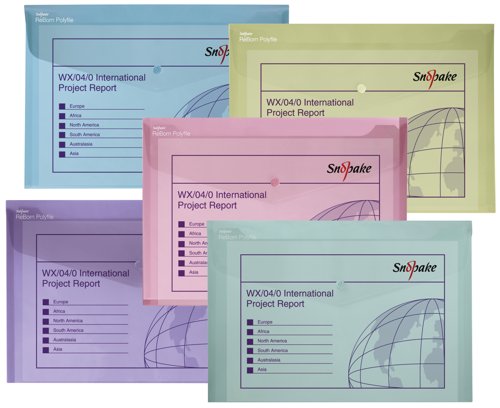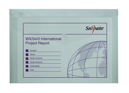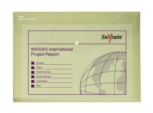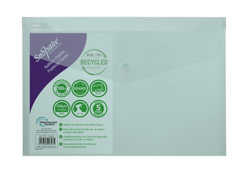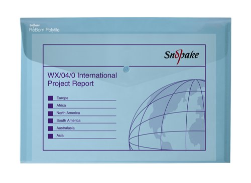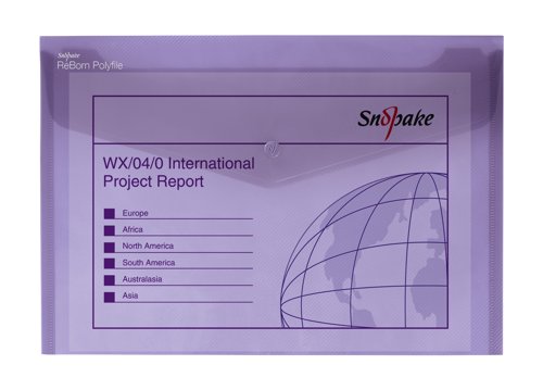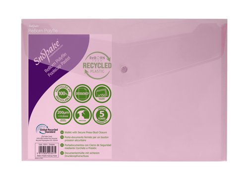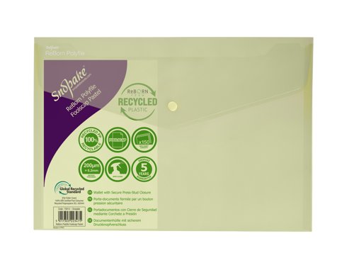 - This Snopake Reborn Polyfile in foolscap size is ideal for punchless filing, you can store and organiser you documents, photographs and artwork in perfect condition in the water-resistant wipe-clean folder. Foolscap size is ideal for storing large envelopes and materials too big for traditional A4 popper wallets. Snopake ReBorn is made from 100% recycled, heavy-gauge and tough polypropylene, the responsible and eco-friendly choice. with a 5 year guarantee. The attractive transparent superline finish in soft pastel hues, is ideal for quick and easy identification of contents, secured by a colour coordinated press-stud closure.
