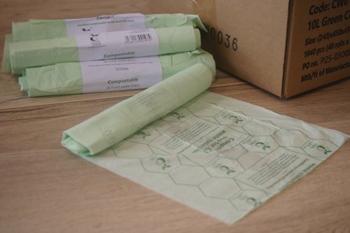 - Good waste management and recycling methods help to support a cleaner, greener planet, preventing unnecessary items being sent to landfill where they struggle to decay. Almost all food waste is recyclable and when it is recycled, it has the ability to breakdown and over time produce compost. These 10 litre capacity, compostable, food waste bin liners, in pale green, visually signal compostability, helping to distinguish them from conventional plastic liners. This pack contains 40 rolls of 26 liners (1,040 liners in total).