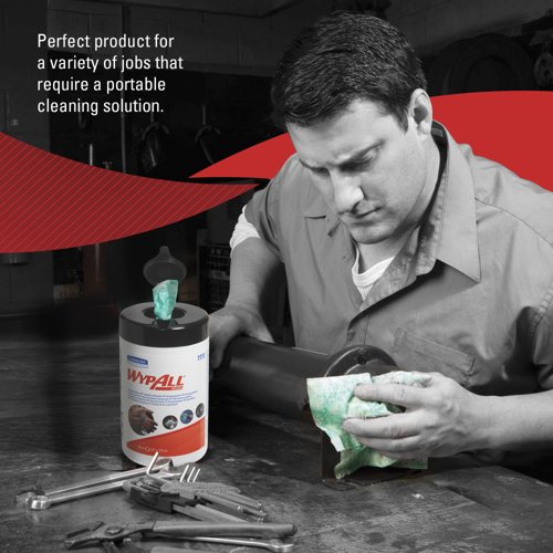 From wiping up grime, oil and grease to soaking up food prep spills, having the right wipe on hand is crucial to your operation. A clean, absorbent and durable alternative to paper towels, rags and shop towels, Wypall cleaning wipes are the perfect product for a variety of jobs that require a portable cleaning solution. Packaged in a centrefeed wipes canister, the green, 1-ply industrial cleaning wipes are dispensed one at a time to reduce waste and maintain hygiene. The multipurpose wipes are pre-saturated for maximum convenience, removing the need to add soap, gel or water; perfect for cleaning hands and routine industrial cleaning such as tools and machinery. Each individual wipe measures 270mm long x 270mm wide.