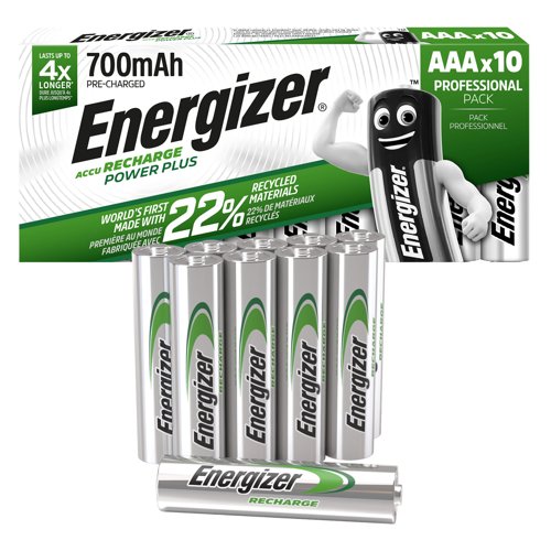 Energizer® Accu Recharge AAA Batteries are the world’s first made with 22% recycled materials and are designed to provide uncompromising performance, Rechargeable batteries can be charged 100s of times. They will keep you on the job with long-lasting professional recharged batteries, even using high drain devices or work tools. Never run out of power with our large bundle packs of 10 pre-charged batteries, making them the ideal solution for professionals, thanks to their re-closeable packaging made of 100% recyclable cardboard. Easy to store and stack, they are perfect for battery storage and will hold charge for up to 1 month when not in use. Designed to provide uncompromising performance, the Energizer® Accu Recharge AAA batteries will keep you on the job even when using high drain devices or work tools. Under typical usage patterns, Energizer® rechargeable batteries can be re-charged hundreds of times, lasting up to a total of 5 years. For best results, pair your Energizer® Accu Recharge batteries with Energizer® chargers.
