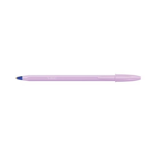 - The BIC Cristal Pastel ballpoint pen brightens up any pencil case. This box of 5 contains matching barrels and caps in 5 different trendy pastel hues. Featuring a medium 1.00mm tip that writes 0.32mm lines in blue ink. The calibrated ink delivery system provides even flow and reliable long-lasting writing. With a hexagonal barrel for the comfort and control, these pens make writing clean, neat and more cheerful with the all-pastel barrels of the latest version of the BIC Cristal pen.