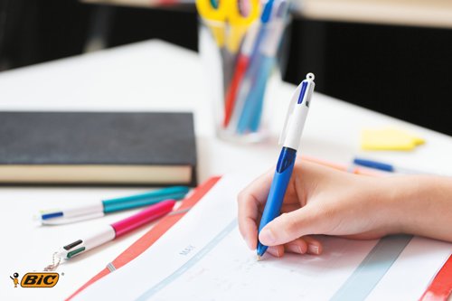 - The Bic 4 Colours Comfort Grip Ball Pen contains 4 different coloured ballpoint pens in one casing, with a retractable design that allows each one to be selcted independently. The wide, round barrel provides a cushioned grip for increased comfort in use. The medium 1.0mm tips write a 0.4mm line width, which is great for note-taking and underlining. The pen contains black, blue, green and red ink, great for colour coordinating your work. This pack contains 12 pens.
